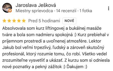 Absolvovala som kurz liftingovej a bukálnej masáže tváre a bola som nadmieru spokojná :) Kurz prebiehal v príjemnom prostredí a uvoľnenej atmosfére. Lektor Jakub bol veľmi trpezlivý, ľudský a zároveň skutočný profesionál, ktorý rozumie tomu, čo robí. Všetko vedel zrozumiteľne vysvetliť a ukázať. Z kurzu som si odniesla nové poznatky a pekný zážitok :) Ďakujem :)