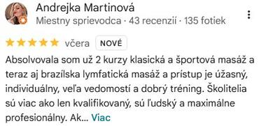 Absolvovala som už 2 kurzy klasická a športová masáž a teraz aj brazílska lymfatická masáž a prístup je úžasný, individuálny, veľa vedomostí a dobrý tréning. Školitelia sú viac ako len kvalifikovaný, sú ľudský a maximálne profesionálny. Ak sa niekto chce stať masérom lebo je to jeho poslanie, určite odporúčam túto školu, ktorá je aj cenovo dostupná. Týmto pozdravujem Janku Dobiáš,Jakuba Lörinca aj Veroniku Vríčanovú za odovzdanie vašich skúseností a vedomostí, ešte sa určite stretneme. Ďakujem ❤️