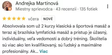 Absolvovala som už 2 kurzy klasická a športová masáž a teraz aj brazílska lymfatická masáž a prístup je úžasný, individuálny, veľa vedomostí a dobrý tréning. Školitelia sú viac ako len kvalifikovaný, sú ľudský a maximálne profesionálny. Ak sa niekto chce stať masérom lebo je to jeho poslanie, určite odporúčam túto školu, ktorá je aj cenovo dostupná. Týmto pozdravujem Janku Dobiáš,Jakuba Lörinca aj Veroniku Vríčanovú za odovzdanie vašich skúseností a vedomostí, ešte sa určite stretneme. Ďakujem ❤️