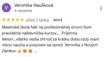 Maserská škola fakt na profesionálnej úrovni.Som pravidelná naštevnička kurzov... .Príjemný lektori...všetko vedia zhrnúť za krátku dobu.vzdy mám nieco naučia a posúvam sa vpred. Veronika z Nových Zámkov.👍☺️😉 …