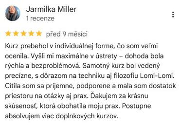 Dakujem pekne za kurz Havajskej masaze. Sme sa aj dost nasmiali, dobra atmosfera v prijemnom prostredi.