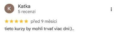 Absolvovala som jeden z Vašich kurzov (zatiaľ) a som spokojná a vďačná za všetky informácie ktoré nám školitelia Zuzka odovzdala vedenie kurzu bolo na výbornú . Môžem len odporučiť . Ďakujem